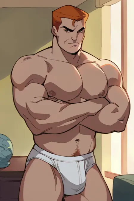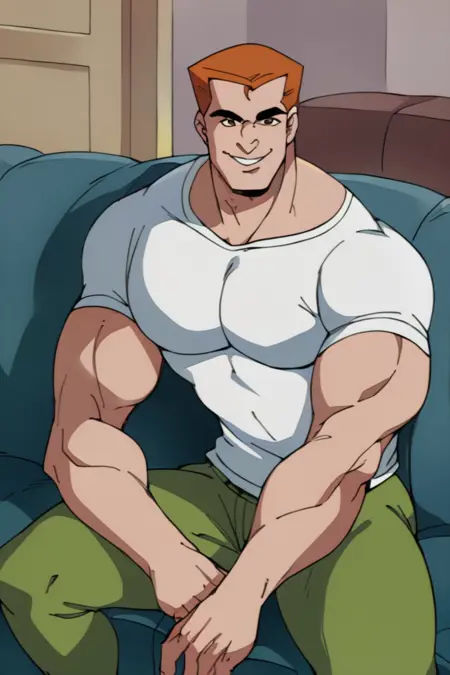eddiebrock, 1boy, solo, male focus, mature male, short hair, orange hair, brown eyes, thick eyebrows, yellow turtleneck sweater, blue jacket, open jacket, green pants,