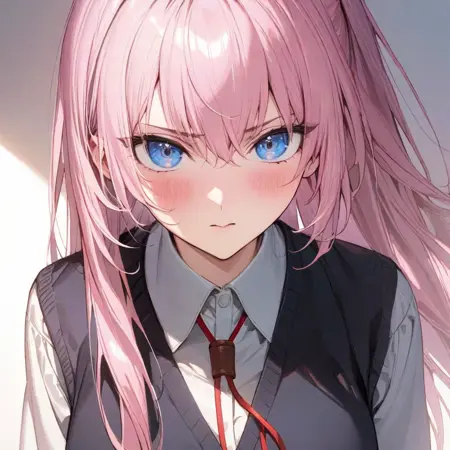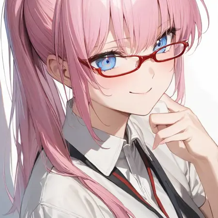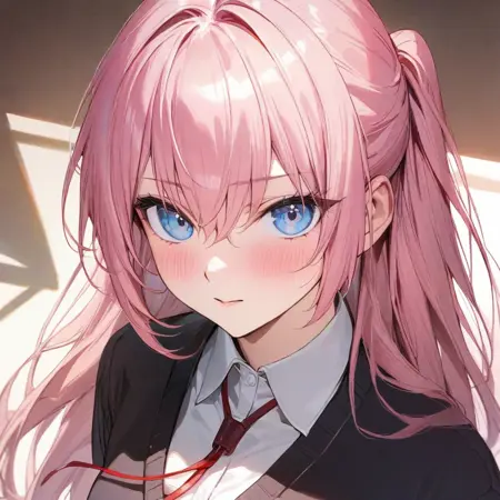 使用关键词 "shikimori, blue eyes, pink hair, long hair, ponytails" 激活。