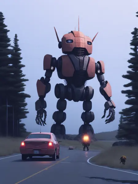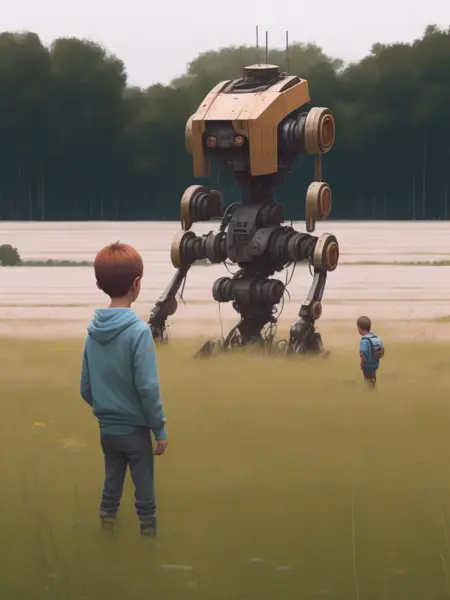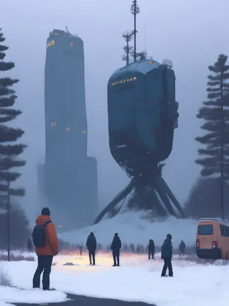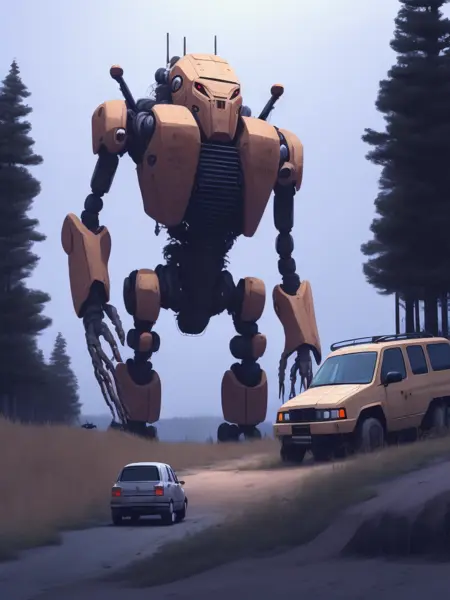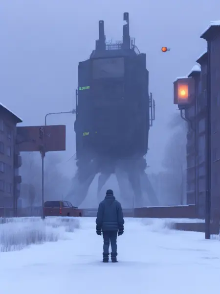 スターレンハグの独特なスタイルは、現実的なディテールとファンタジー的要素を融合させ、神秘的で驚きを感じさせる雰囲気を創り出している。その作品には、巨大な機械やロボット生物、謎めいた現象が、静かなスカンジナビアの風景を背景に描かれることが多い。