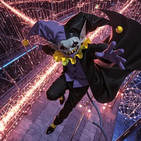 Pony标签:jevil, score_9, source_anime, 1boy, solo, full body, 有色皮肤, 尾巴, 帽子, 尖耳朵, 尖牙, 有色眼白, 有色舌头
