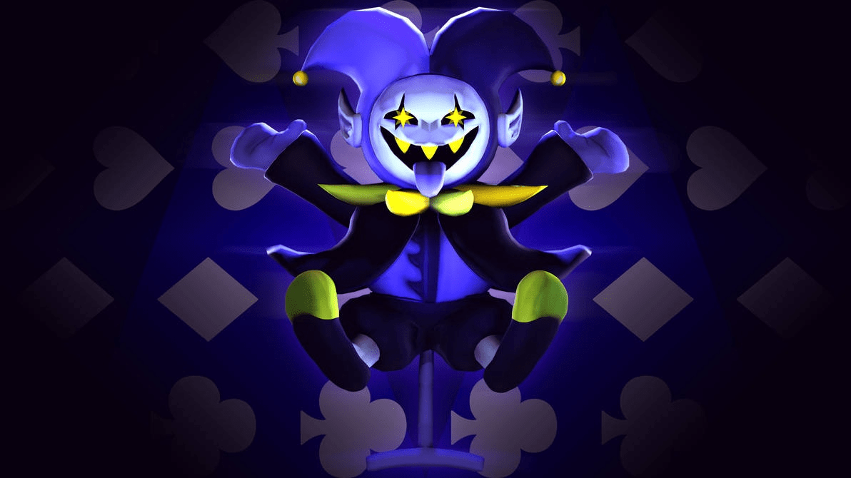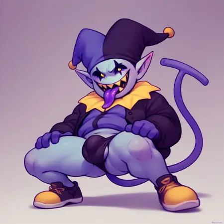 精彩标签:jevil, 1boy, solo, full body, 小丑, 有色皮肤, 灰色皮肤, 尾巴, 帽子, 尖耳朵, 尖牙, 有色眼白, 有色舌头