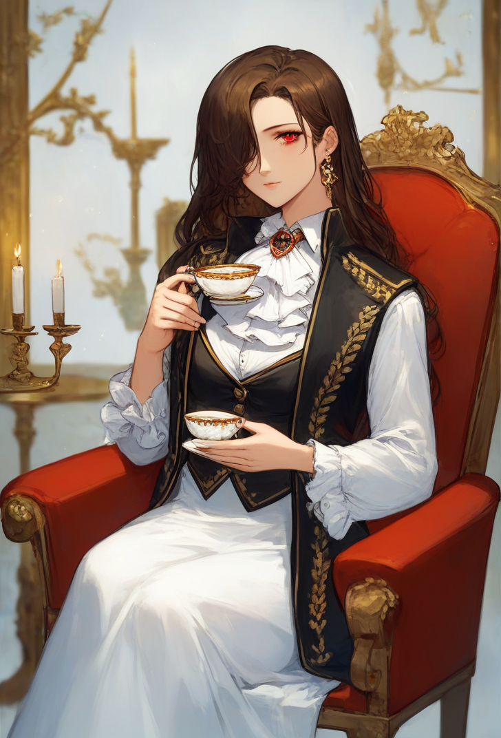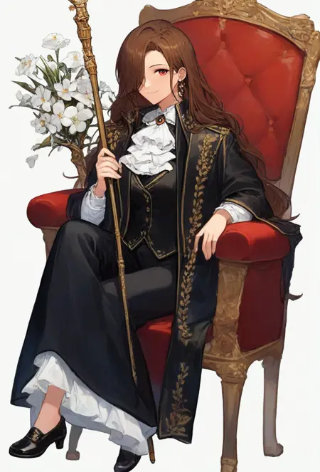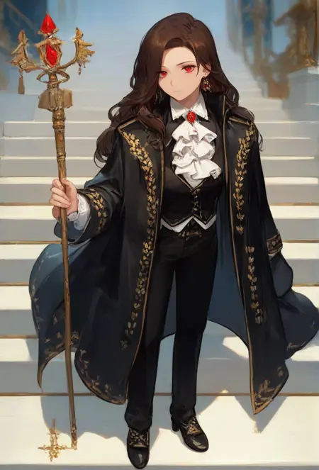 black pants, black vest, black coat, open coat, earrings, jewelry, white ascot, staff, gold ornament