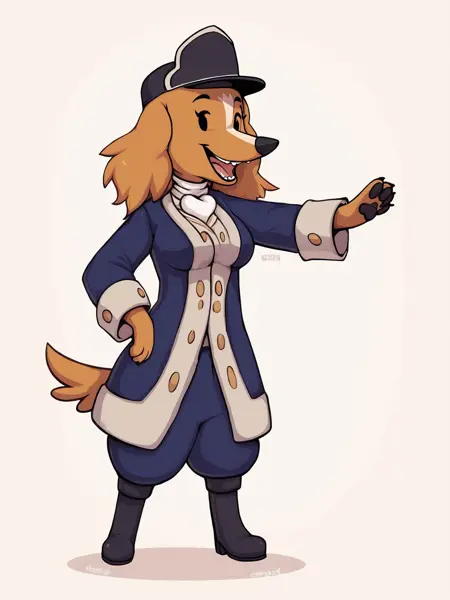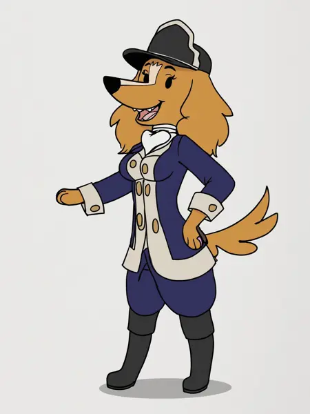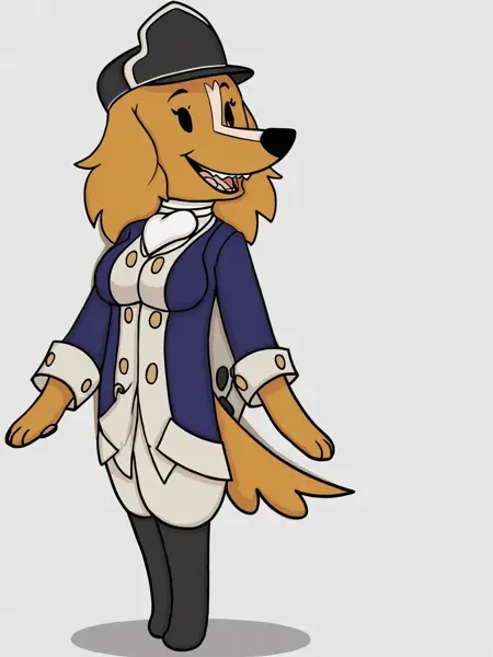 She looks like a Rough Collie and wears a military coat of the American Revolutionary War, she is crossdressing as a male soldier. Based in the real history of Deborah Sampson.