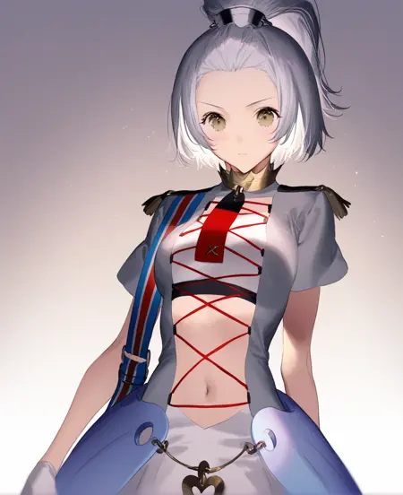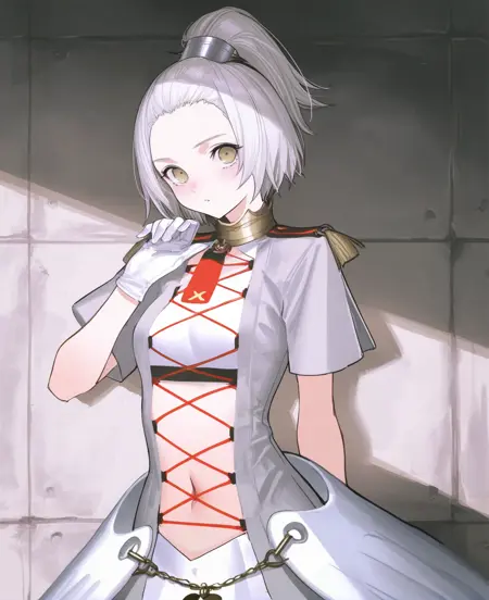 x \(caligula 2\), 白发, 黄眼, 露脐上衣, 高马尾, 偶像服装, 饰品, 肚脐, 吊坠, 红色丝带, 条纹丝带, 白色手套