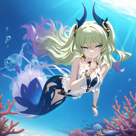 Mobius_Swimsuit, 胸元, 肩を露出, 青い角の髪飾り, 水着, ビキニ, ドレス, 長いスカート, 白いビキニ, マーメイドドレス, 青いスカート, 両サイドアップ, フリル, ジュエリー,
