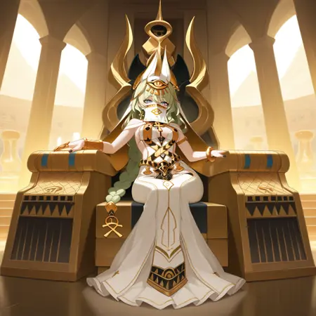 Mb_Egp, 古代エジプト風の衣装, エジプト風衣装, 編み込みポニーテール, 袖なしドレス, 代替長いスカート, 開いたスカート, 白いスカート, 白いドレス, 偽の動物の耳, 髪飾り, 口元のヴェール, 透けている衣装, 透けているヴェール, 胸の間, 動物のフード, フード付きのマント, 胸元, クロスストラップ, アンクのネックレス, 代替衣装カットアウト, 代替サイドカットアウト, 代替ジュエリー, 肩を露出, 交差するベルト, サイドなしドレス, 白い骨盤カーテン, 黒い太ももストラップ, 片方の手首ガード, 包帯を巻いた腕, 金の爪リング, ウリスト,