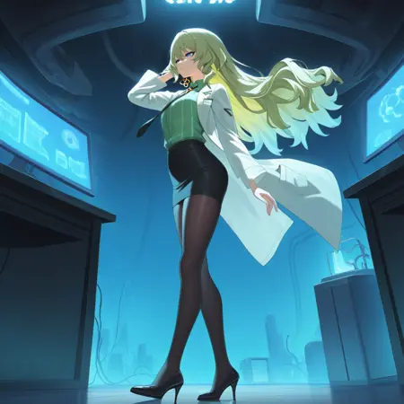 Mobius_Lab, ライニング付きシャツ, ルーズなネクタイ, 黒いネクタイ, 緑色のシャツ, シャツ, へそ, ベルト, へそを覆う, チョーカー, 黒いスカート, ミニスカート, ベルト, パンスト, ラボコート, 鎖骨, ハーフグローブ, ドレス, 袖なしシャツ,