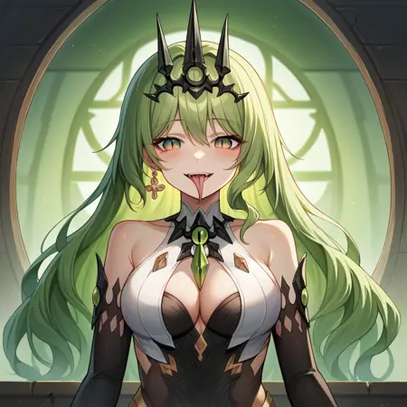 Mobius, gradient eyes, green hair, wavy hair, long hair, slit pupils,