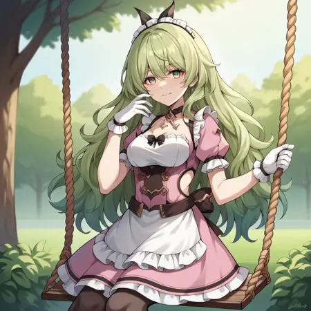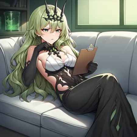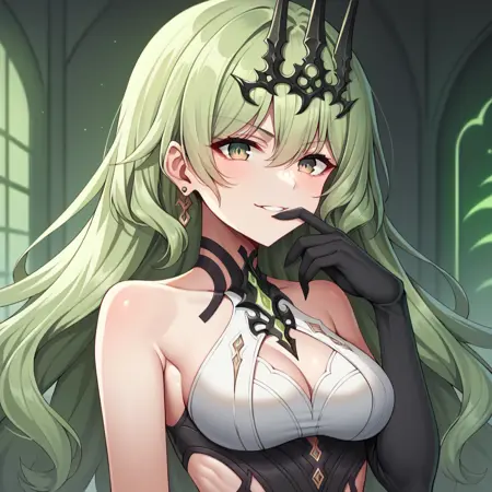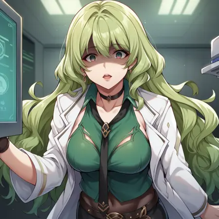 Mobius, gradient eyes, green hair, wavy hair, long hair, slit pupils,