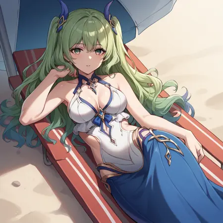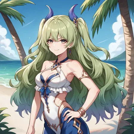 Mb_Swm, horn hair ornament, alt single earring, jewelry, white one-piece swimsuit, frilled swimsuit, cleavage cutout, cleavage, blue breast strap, halterneck, bare shoulders, sideless swimsuit, bracelet, thigh cutout, clothing cutout, long skirt, blue skirt,