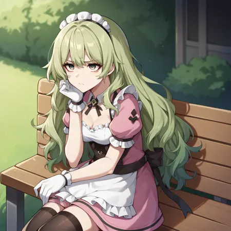 Mobius_Pink, pink dress, maid apron, maid headdress, white gloves, black thighhighs, puffy sleeves, short sleeves,