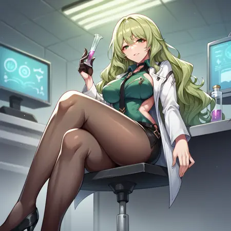 Mobius_Lab, collared shirt, loose necktie, black necktie, green shirt, shirt, navel, belt, covered navel, choker, black skirt, miniskirt, belt, pantyhose, lab coat, collarbone, half gloves, dress, sleeveless shirt,