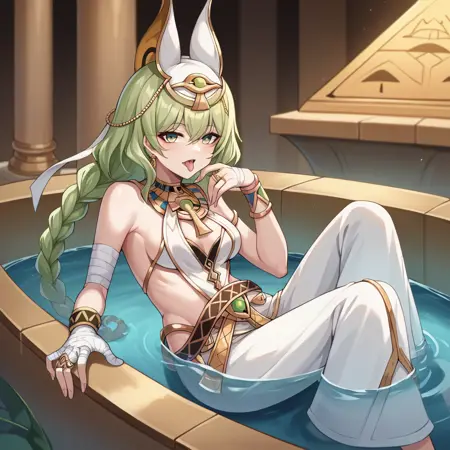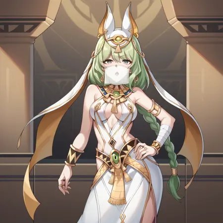 Mb_Egp, ancient egyptian clothes, egyptian clothes, braided ponytail, sleeveless dress, alt long skirt, open skirt, white skirt, white dress, fake animal ears, hair ornament, mouth veil, see-through clothes, see-through veil, between breasts, animal hood, hooded cloack, cleavage, criss-cross straps, ankh necklace, alt clothing cutout, alt side cutout, alt jewelry, bare shoulders, crossed belts, sideless dress, white pelvic curtain, black thigh strap, single wrist guard, bandaged arm, gold claw ring, wristlet,