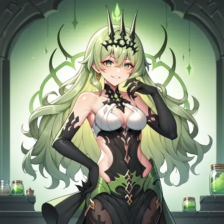 Mb_Def, black crown, cleavage, side cutout, sideless leotard, black leotard, fishnet bodysuit, fishnet pantyhose, white halter top, chest cutout, chest spike, black pendant, single earring, black skirt, mermaid dress, skirt cutout, green trim, single detached sleeve, see-through sleeves, pleated sleeves, black gloves, asymmetrical gloves, green claw ring, single elbow glove, bare shoulders, black dress,