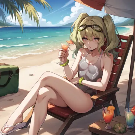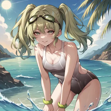 Mb_Mch, 경기용 수영복, 회색 원피스 수영복, 검은 허벅지 벨트, 가슴 노출, 녹색 팔찌, 안경, 머리에 안경, 트윈테일,