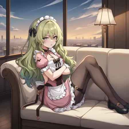 Mb_Maid, 흰색 브라, 프릴 브라, 분홍색 코르셋, 메이드, 프릴 앞치마, 흰색 앞치마, 분홍색 치마, 분홍색 드레스, 프릴 드레스, 분리된 소매, 통풍 있는 짧은 소매, 분홍색 소매, 프릴 소매, 검은 리본, 가슴 리본, 머리 리본, 흰색 장갑, 프릴 장갑, 대체 측면 절개, 단일 팬티하이즈 다리, 대체 검은 팬티하이즈, 대체 단일 허벅지하이, 대체 검은 허벅지하이, 단일 가스켓 스트랩, 프릴 허벅지 스트랩, 브라 스트랩,