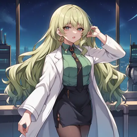 Mb_Stg, 검은 느슨한 넥타이, 단일 귀걸이, 소매 없는 셔츠, 어두운 녹색 셔츠, 가슴 노출, 펜던트 초커, 배꼽 가림, 검은 바디스톡킹, 검은 미니스커트, 반장갑, 검은 장갑, 흰색 코트, 칼라 코트, 긴 소매, 흰색 소매, 단일 허벅지하이, 검은 허벅지하이, 단일 다리 팬티하이즈, 검은 팬티하이즈, 녹색 벨트 스트랩, 갈색 벨트, 언더버스트,