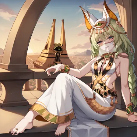 Mb_Egp, 고대 이집트 복장, 이집트 복장, 땋은 토끼 꼬리, 소매 없는 드레스, 대체 긴 스커트, 열린 스커트, 흰색 스커트, 흰색 드레스, 가짜 동물 귀, 머리 장식, 입 가리개, 투명 의류, 투명 가리개, 가슴 사이, 동물 후드, 후드 달린 망토, 가슴 노출, 십자 스트랩, 안크 목걸이, 대체 의류 절개, 대체 측면 절개, 대체 보석, 드러난 어깨, 십자 벨트, 사이드리스 드레스, 흰색 골반 커튼, 검은 허벅지 스트랩, 단일 손목 보호대, 붕대 감긴 팔, 금발톱 반지, 손목장식,