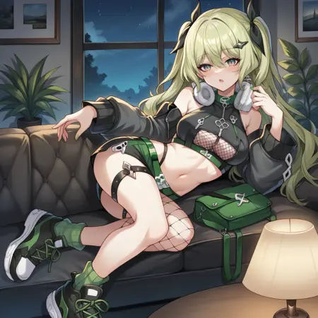 Mb_Clb, 피시넷 바디수트, 피시넷, 대체 단일 허벅지하이, 비대칭 하의, 피시넷 허벅지하이, 허벅지 가스켓, 검은 허벅지 스트랩, 짧은 반바지, 녹색 벨트, 어깨 가방, 녹색 리본, 녹색 리본, 리본 bow, 대체 분리된 소매, 통풍 있는 긴 소매, 넓은 소매, 드러난 어깨, 크롭탑, 회색 크롭탑, 지퍼 상의, 넓은 양말, 색상이 다른 양말, 대체 가슴 절개, 목에 헤드폰, 머리핀, 머리 리본, 검은 리본, 팬티 스트랩, 복부, 배꼽, 언더부브 절개, 대체 보석, 검은 귀걸이, 녹색 초커,