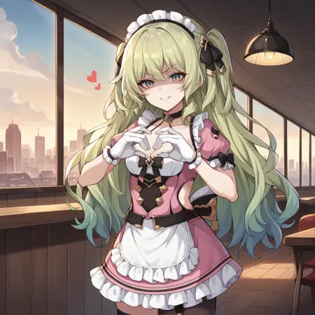 Mobius_Pink, 분홍색 드레스, 메이드 앞치마, 메이드 머리 장식, 흰색 장갑, 검은 허벅지하이, 통풍 있는 소매, 짧은 소매,