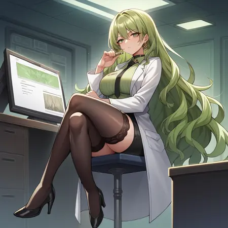 Mb_Str, 대체 칼라 셔츠, 단일 귀걸이, 녹색 셔츠, 줄무늬 셔츠, 검은 넥타이, 팬티하이즈, 갈색 팬티하이즈, 검은 연필 치마, 랩코트, 흰색 랩코트,