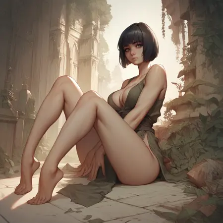 ashleybb, short hair, 1girl, large breasts, high heels, thighhighs, nude, sitting, nipples, lipstick, long legs