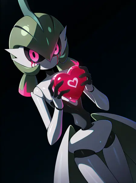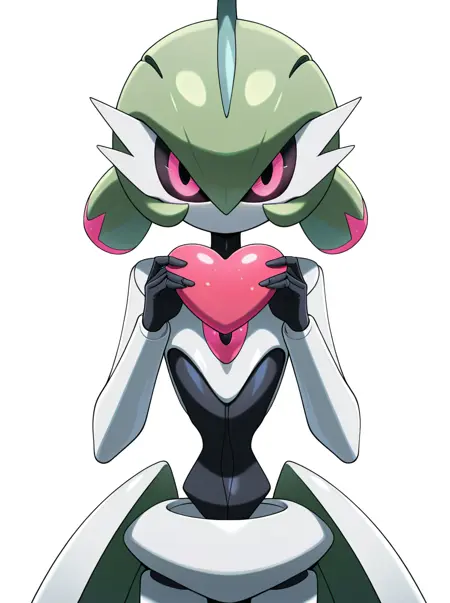 提示词:宝可梦(生物),单人,绿发,站立,彩色皮肤,白皮肤,粉红色眼睛,臂刃,彩色巩膜,