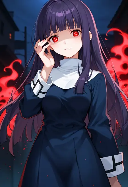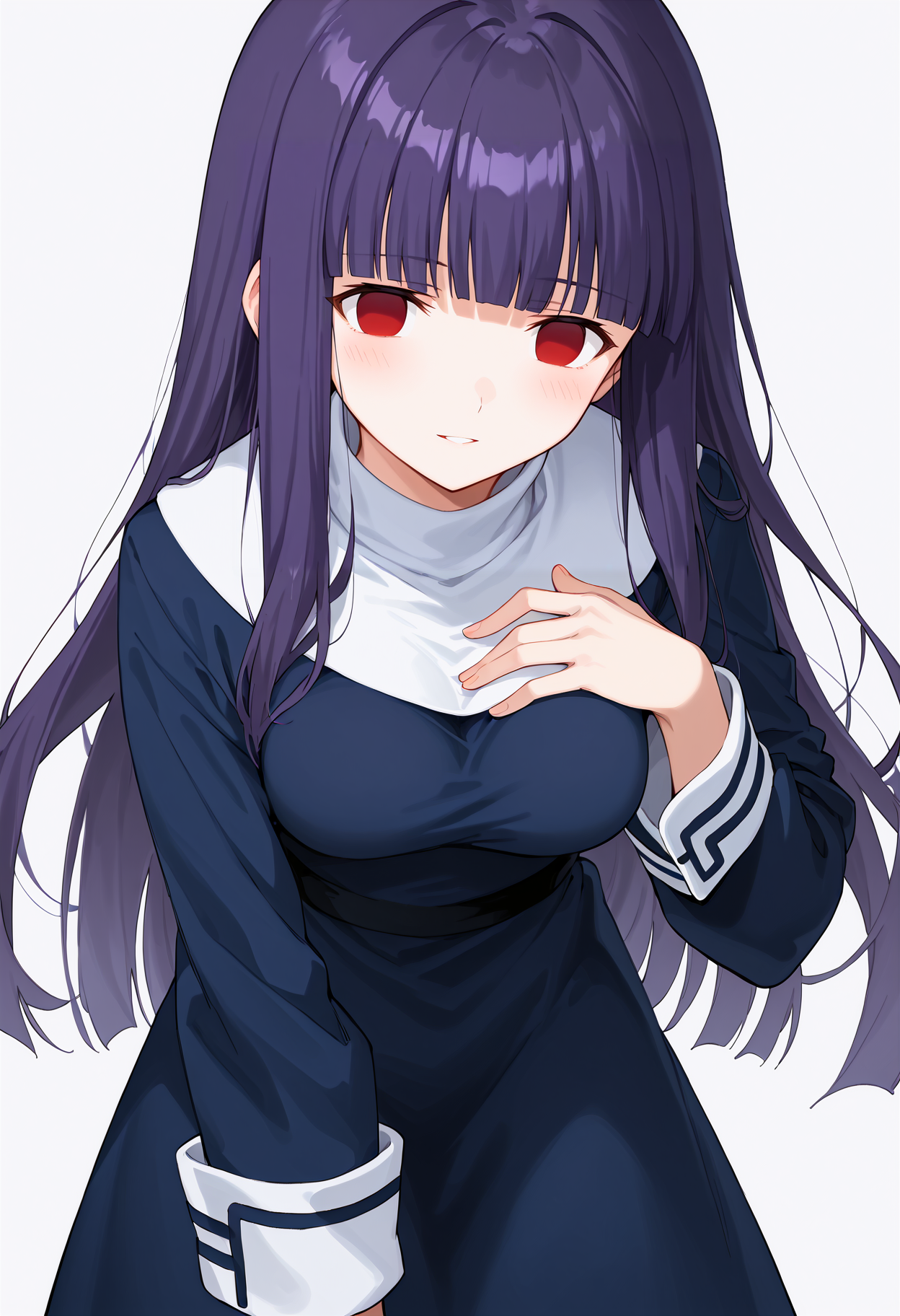 基础:a_fujino, 1girl, 单人长发, 紫发, 齐刘海, 红眼, 空洞眼神, 蓝色连衣裙, 白色高领, 长袖, 长裙, 袖口, 中等胸部,
