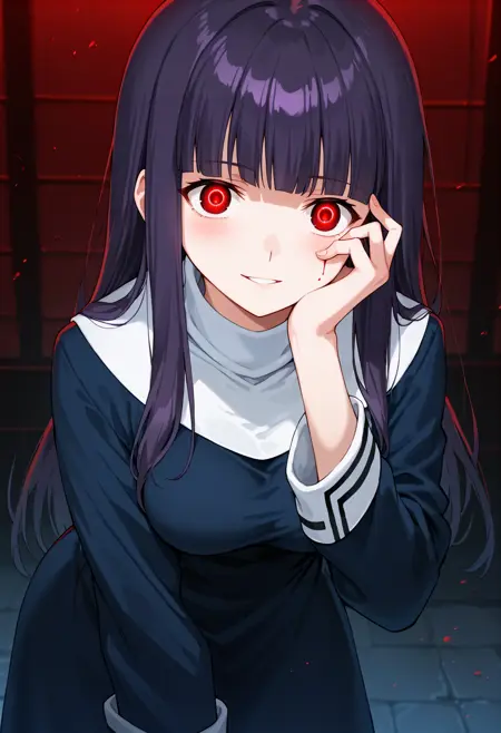 Base: a_fujino, 1girl, solo long hair, purple hair, blunt bangs, red eyes, empty eyes, blue dress, white turtleneck, long sleeves, long dress, sleeve cuffs, medium breasts,