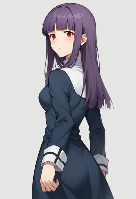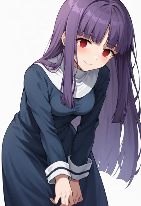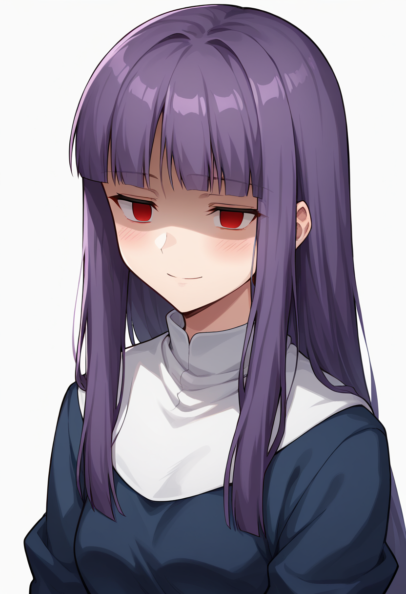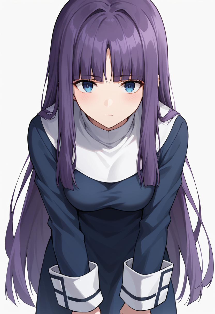 Base: a_fujino, 1girl, solo long hair, purple hair, blunt bangs, red eyes, empty eyes, blue dress, white turtleneck, long sleeves, long dress, sleeve cuffs, medium breasts,