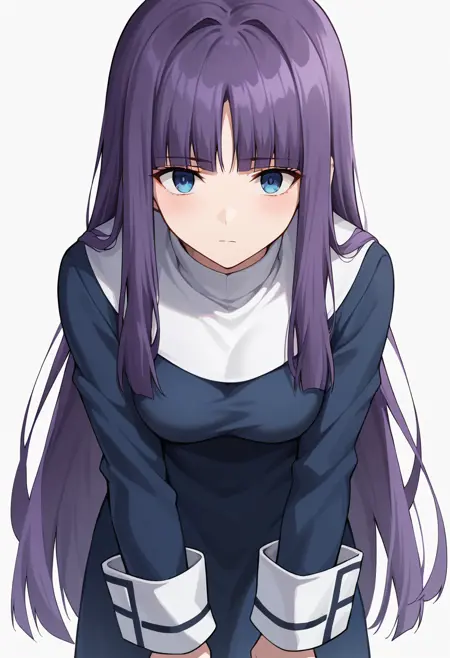 基础:a_fujino, 1girl, 单人长发, 紫发, 齐刘海, 红眼, 空洞眼神, 蓝色连衣裙, 白色高领, 长袖, 长裙, 袖口, 中等胸部,