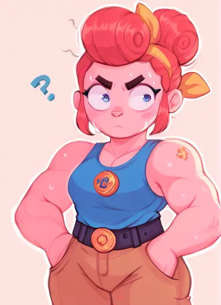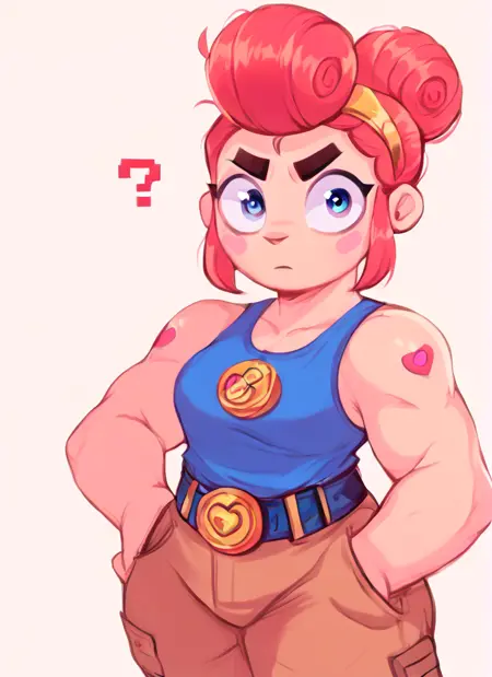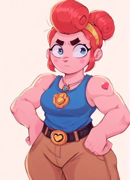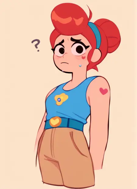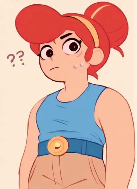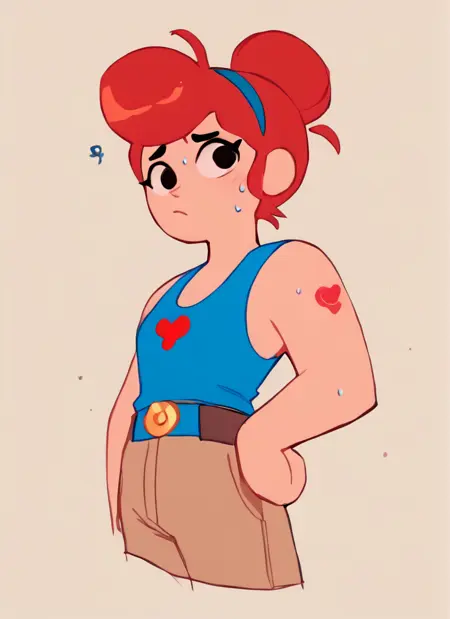 ,blue tank top, belt , brown pants ,
