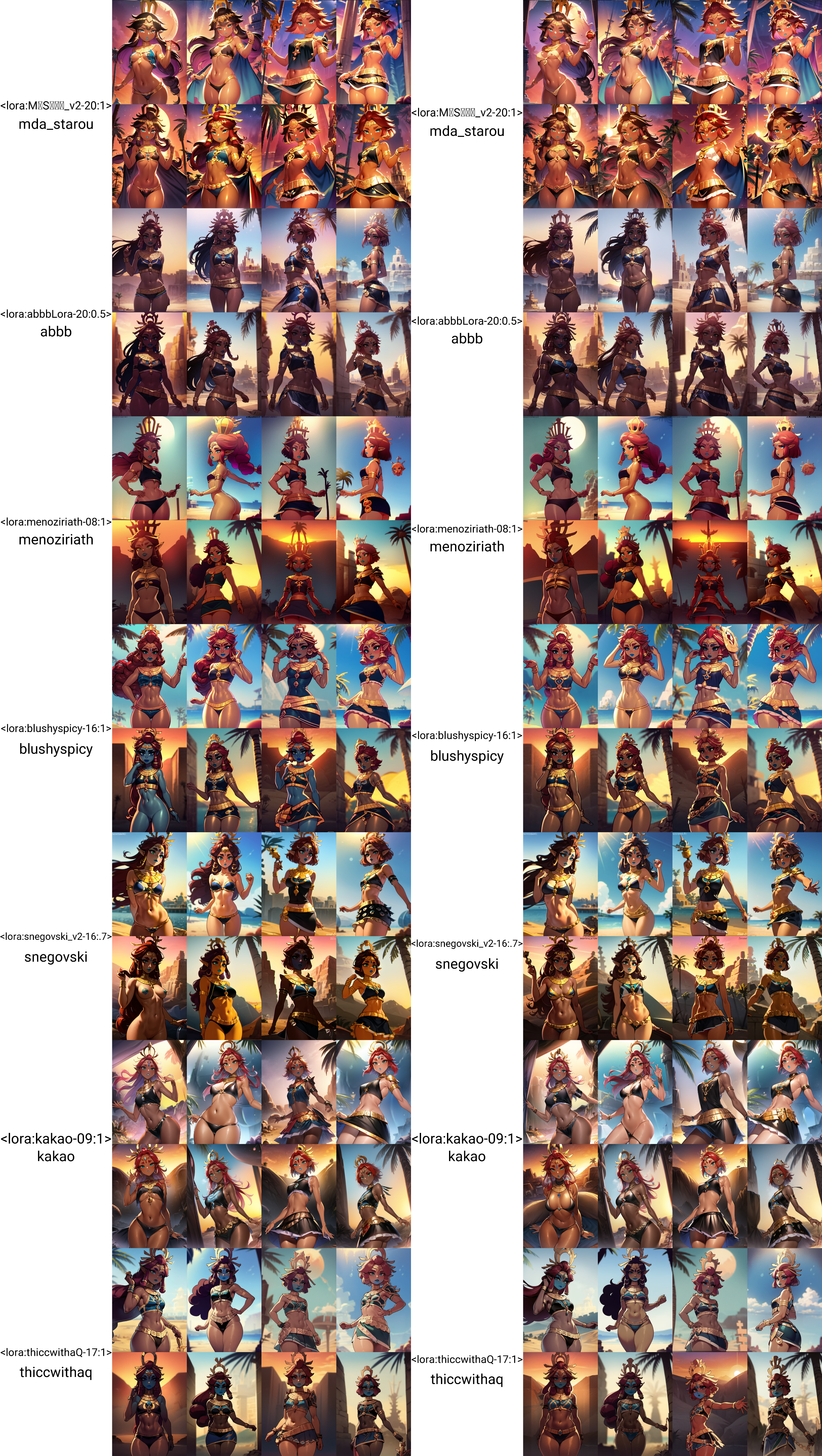 举个例子,我将所有风格LoRA放入一个XYZ图表中测试。有些权重设置得略高,但总体而言我对它的灵活性非常满意。希望在其他检查点上也能有同样效果。