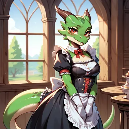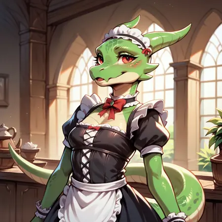 例のプロンプト: Kobold, furry dragon, tail, short stature, 1girl, green eyes, red scales