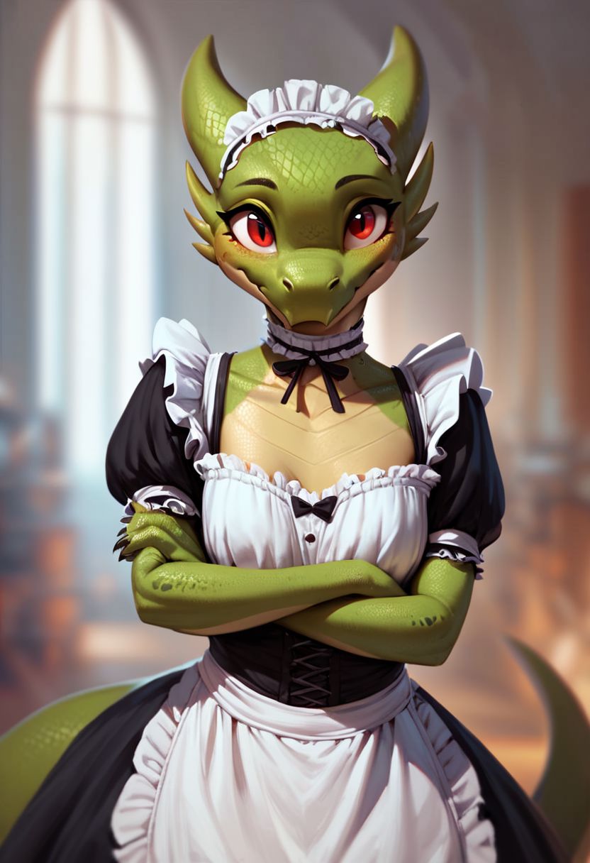 例のプロンプト: Kobold, furry dragon, tail, short stature, 1girl, green eyes, red scales