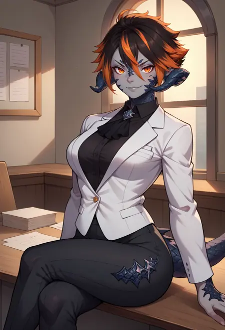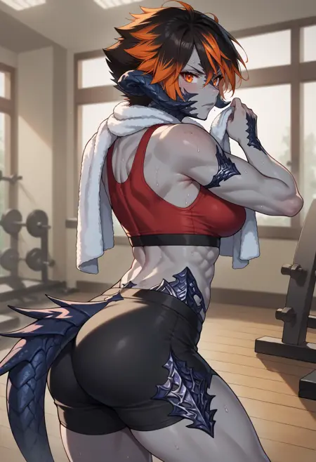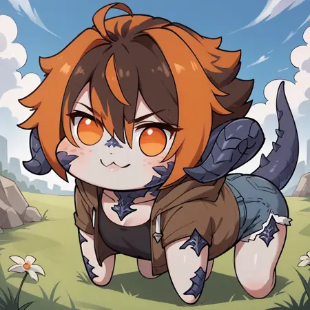 Trigger: "Kyarine, colored skin, grey skin, grey lips, orange eyes, freckles, dragon girl, dragon horns, black scales, short hair, spiked hair, streaked hair, black hair, dragon tail, toned" always needed for accuracy.