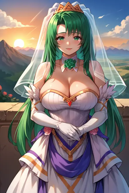 ウェディングセシリアには、「bridCeci, green hair, green eyes, bridal veil, tiara, detached collar, wedding dress, elbow gloves, feather trim」を追加してください。