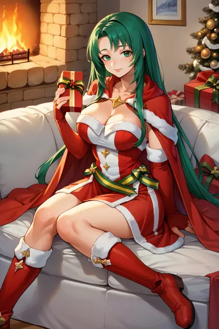 ウィンターセシリアには、「winCeci, green hair, green eyes, red cape, fur trim, red dress, cleavage, bare shoulders, red skirt, red gloves, fingerless gloves, elbow gloves, red boots」を追加してください。