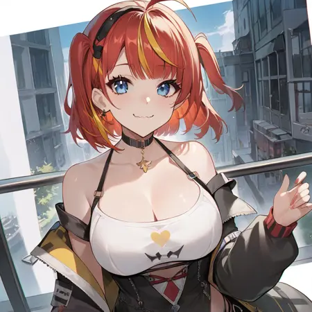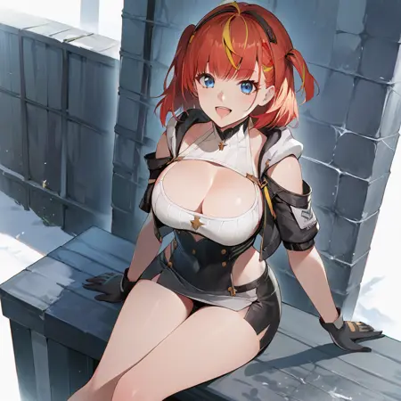 「tess kotkin,」を使用してアクティブ化してください。外見タグは「赤髪、青い目、ストライプ髪、黄色い髪、大きな胸、短髪、アホ毛」です。