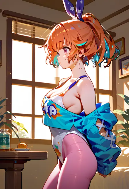 feverwawa, takanashi kiara, white leotard, cleavage, ponytail, pink pantyhose