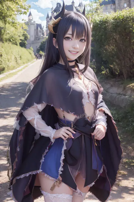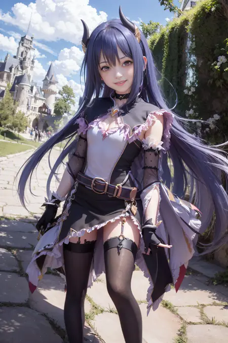 기본 옷차림: "각진 뿔, 파란 머리카락, 코콜러, 캐플릿, 드레스, 장갑, 팔꿈치 장갑, 몸통 자국, 팬티스타킹, 흰색 다리 보호대, 검은 신발, 부츠, rei \\(princess_connect!\\),"