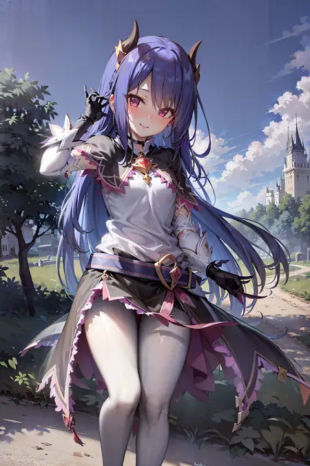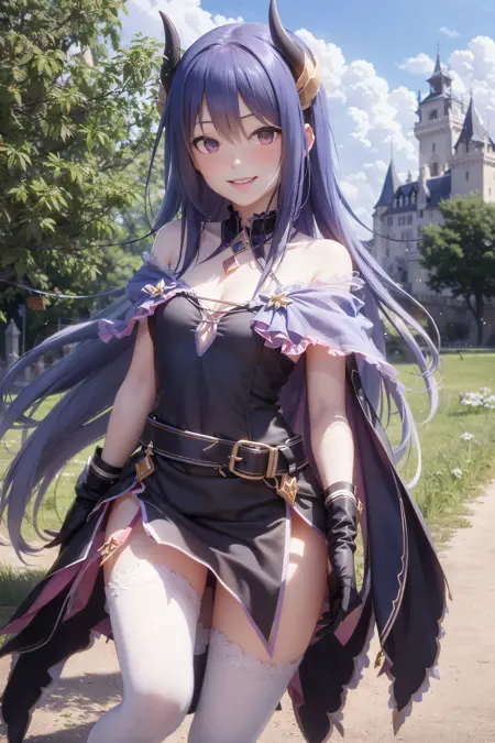原始服装: horns, blue hair, choker, capelet, dress, gloves, elbow gloves, sheath, pantyhose, white legwear, black footwear, boots, rei \(princess_connect!\)