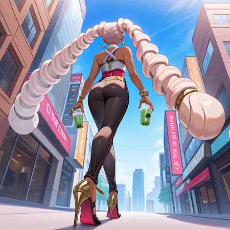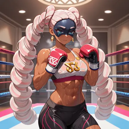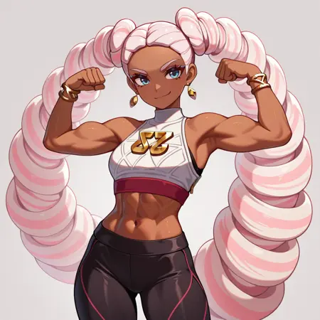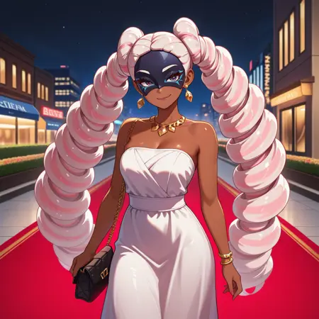 Optional: Dark skin, jewelry, long hair, earrings, mask, drill hair, white pink hair, crop top, tights