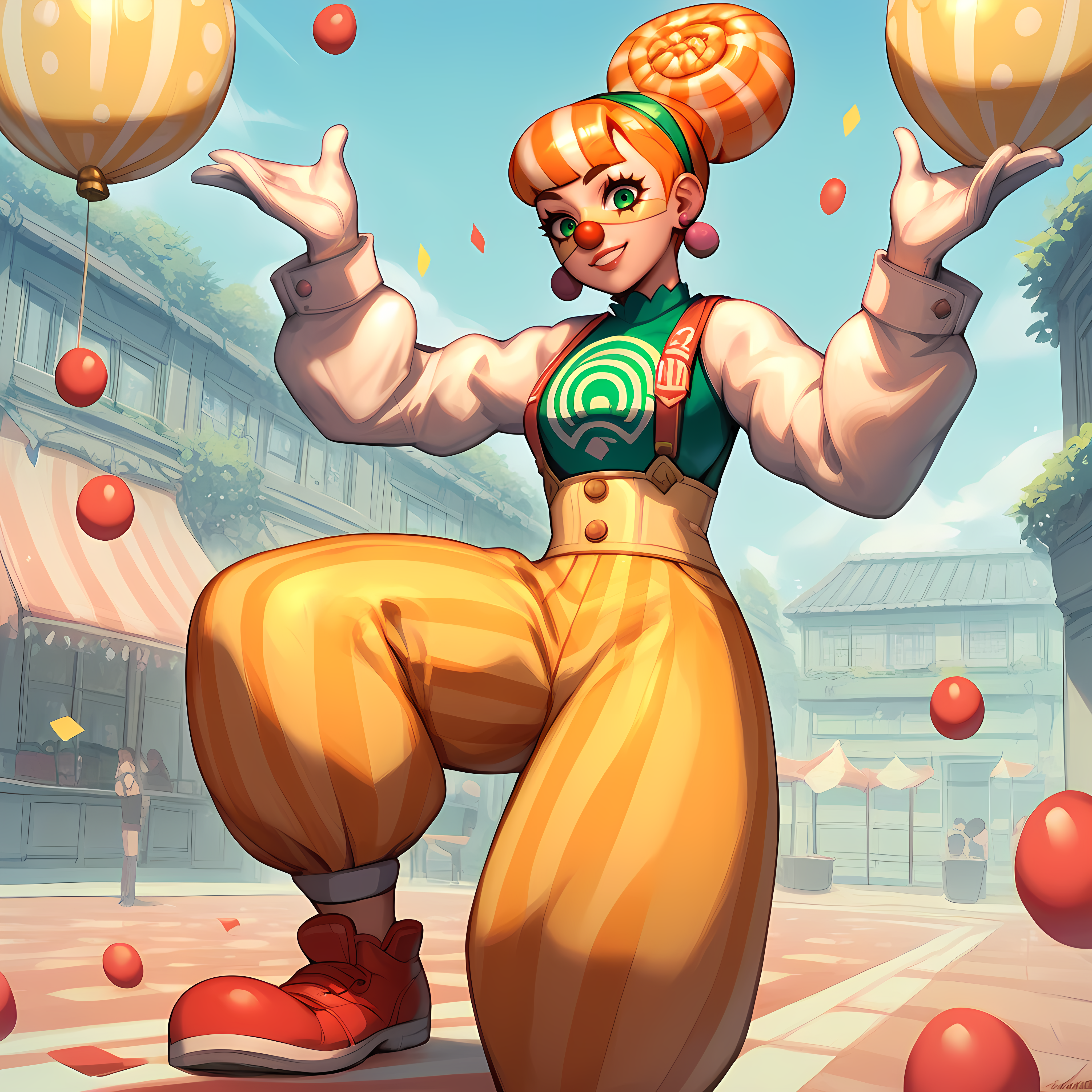 オプション:イヤリング、黄色のマスク、オレンジ色の髪、手袋、化粧、緑の目、サスペンダー、髪の結び目、ポカドット
