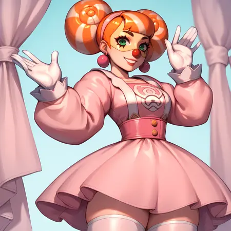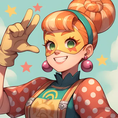 Earrings, yellow mask, orange hair, gloves, makeup, green eyes, suspenders, hair bun, polka dots