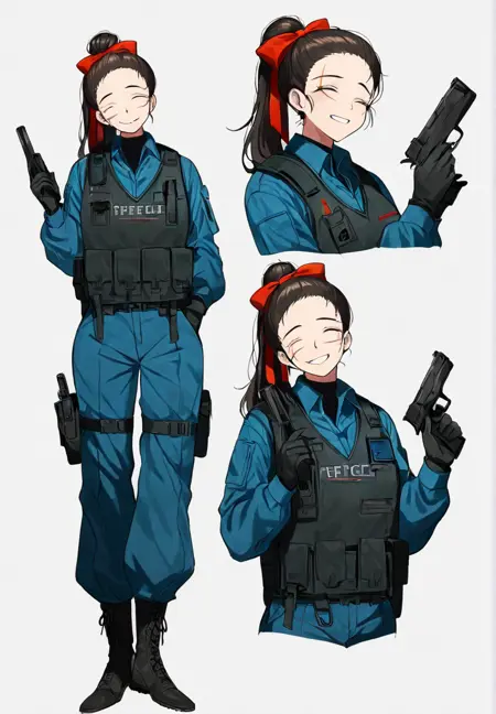 dark blue shirt, long sleeves, dark blue pants, bulletproof vest, black footwear, black gloves