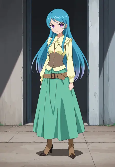 HarkaKami, 1girl, solo, purple eyes, blue hair, long hair, yellow shirt, necklace, long sleeves, corset, green skirt, long skirt, belt, thighhighs, boots, high heels,
