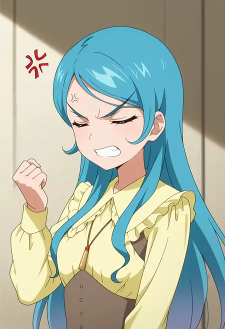 HarkaKami, 1girl, long hair, blue hair, purple eyes, shirt, yellow shirt, skirt, blue skirt, long skirt, shoes