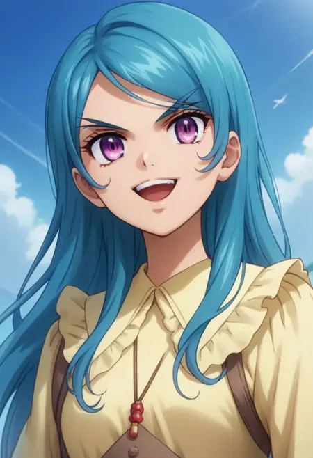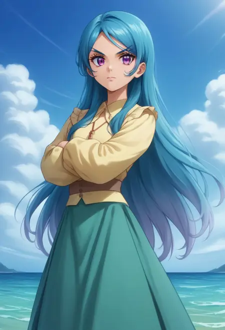 HarkaKami, 1girl, 长发, 蓝发, 紫色眼睛, 上衣, 黄色上衣, 裙子, 蓝色裙子, 长裙, 鞋子