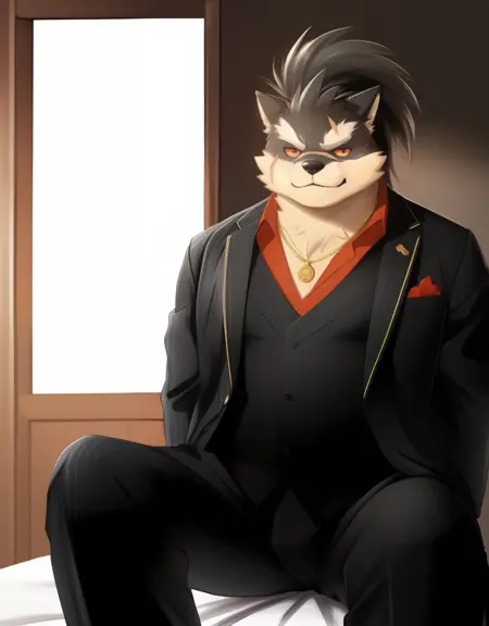 相关词:棕色毛发,白色毛发,双色毛发,短发,刺猬头,马尾,胸部毛发,男性阴毛,黑眼睛,红眼睛,红色巩膜,彩色巩膜,单眼遮挡,浓眉,狗尾,狼尾,狗男孩,狼男孩,狗耳朵,狼耳朵,动物耳朵,动物鼻子,吻部,尖牙,獠牙,面部伤疤,脸颊伤疤,胸部伤疤,手臂伤疤,鼻子伤疤,绷带,武士,草鞋,护臂,日本铠甲,武器,刀, katana,印花和服,花卉印花,卷起袖子,腰围裙,黑色围裙,头带,正式,红色衬衫,有领衬衫,条纹衬衫,黑色夹克,西装外套,长袖,黑色背心,黑色裤子,腰带,鞋子,黑色鞋履,项链,白色手套,骨盆帘,爪印
